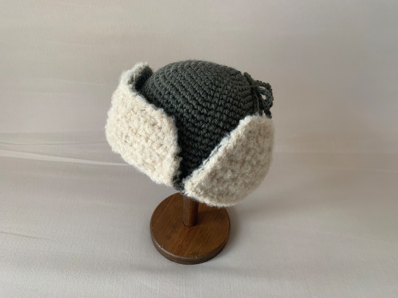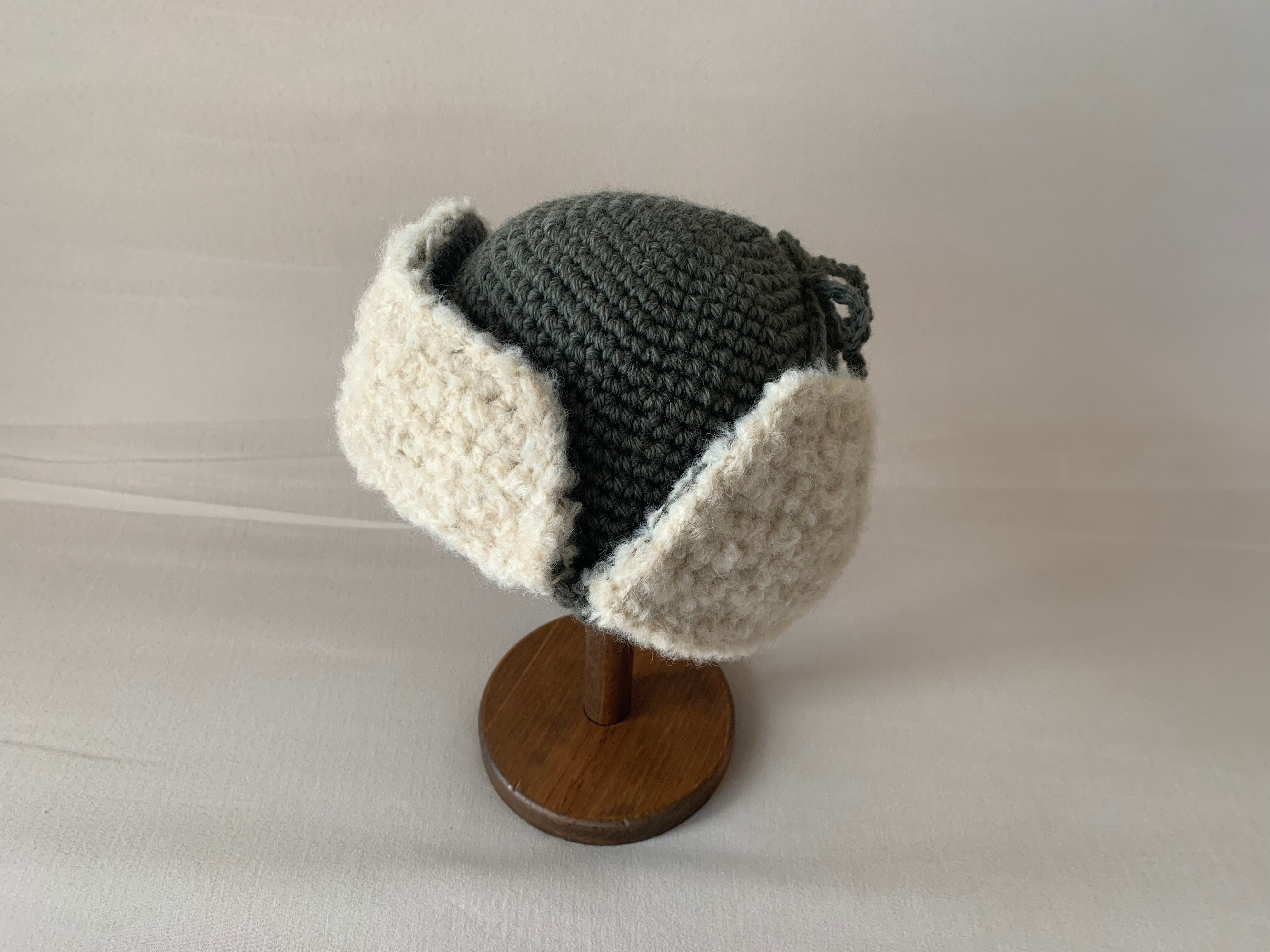 グレー掛かったような、落ち着いた色味のカーキの糸で編みました。